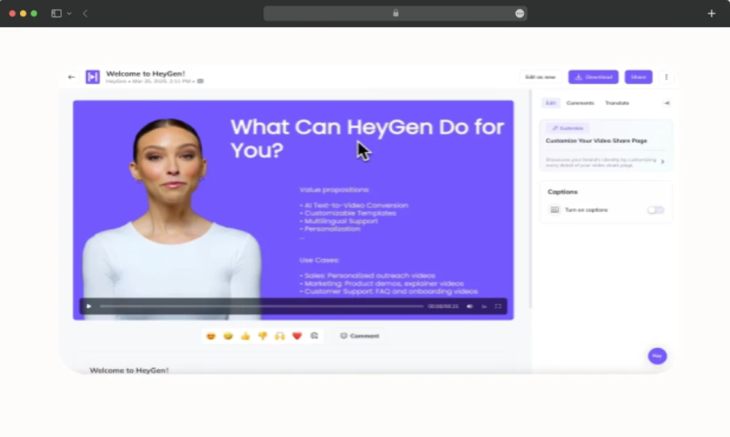 HeyGen 为企业和开发者提供自动化视频制作的 API。此功能可用于创建个性化的营销活动视频,或简化内部沟通。